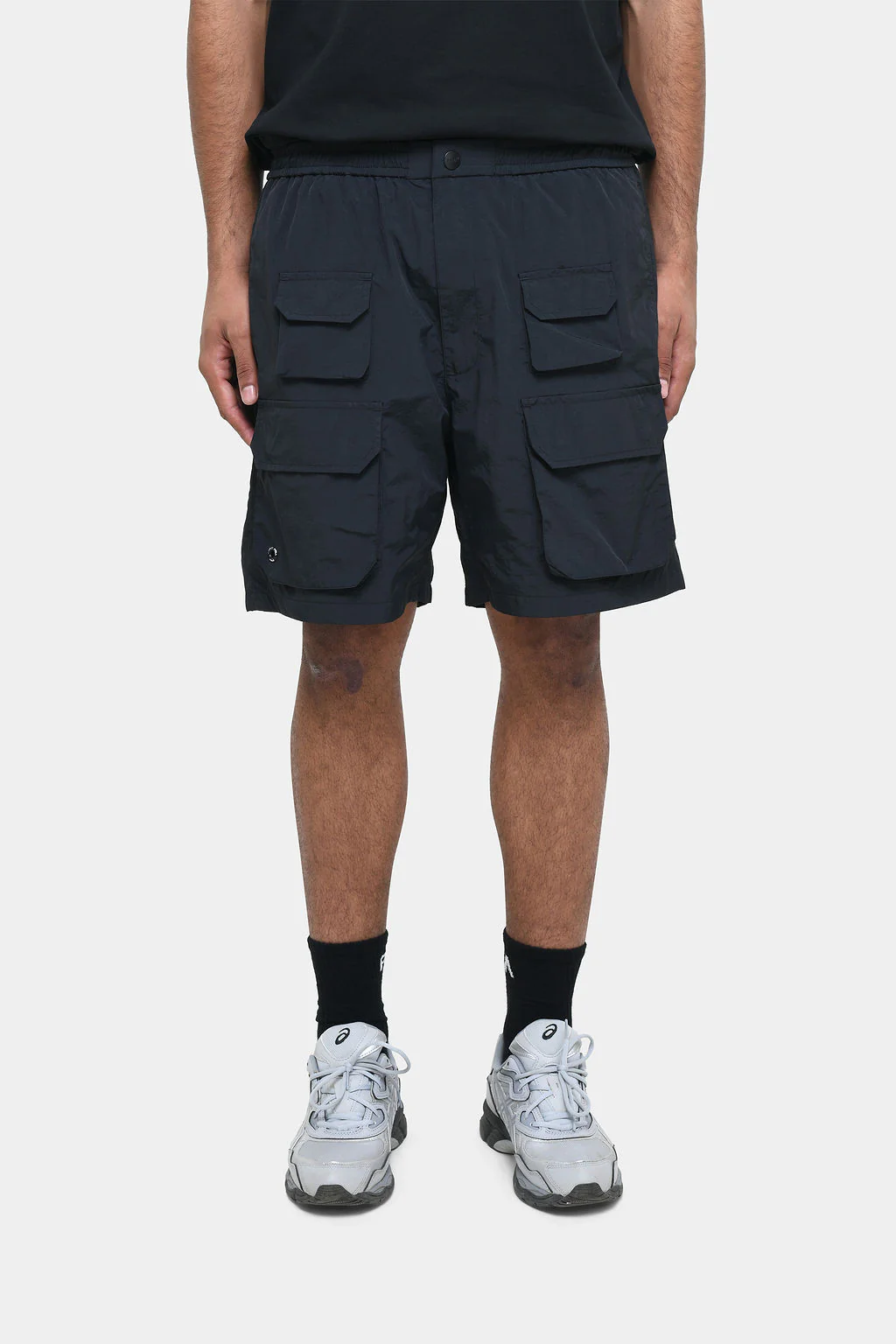 Relaxed leg cargo short in a Black, technical breathable Nylon with a mesh lining.